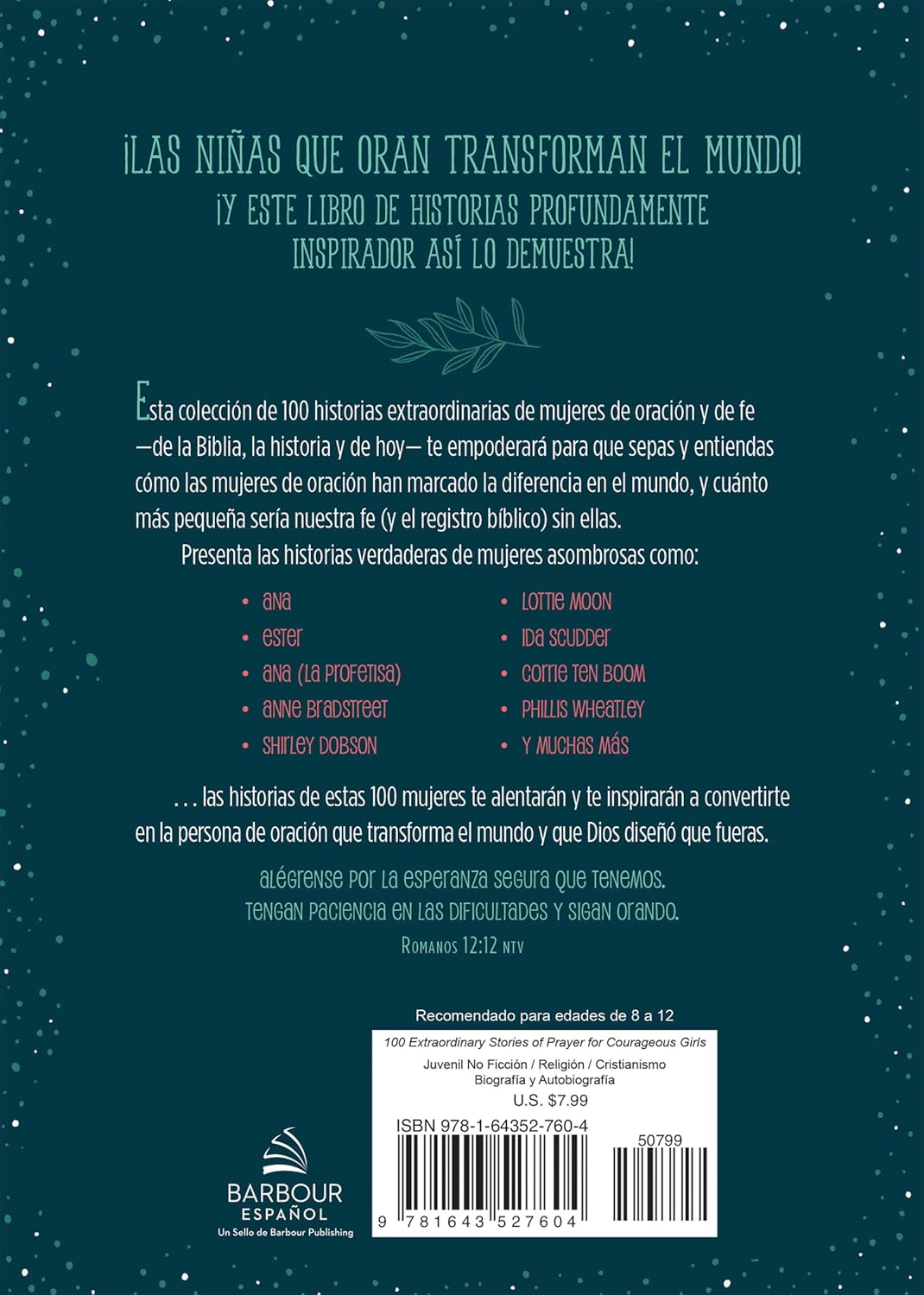 Ideal para las niñas de tu vida, de ocho años en adelante, esta colección de 100 historias extraordinarias de mujeres de oración y de fe —de la Biblia, la historia y de hoy— empoderarán a las niñas que saben y entienden cómo las mujeres de oración han marcado la diferencia en el mundo, y cuánto más pequeña sería nuestra fe (y el registro bíblico) sin ellas. ¡Con ilustraciones a toda plana y a todo color, junto a las verdaderas historias de oración como Ana, Ester, Anne Bradstreet, Shirley Dobson, Lottie Moon, Ida Scudder, Corrie ten Boom, Phillis Wheatley y muchas más, las historias de estas 100 mujeres alentarán e inspirarán a las niñas a convertirse en las transformadoras del mundo mediante la oración que Dios diseñó que fueran!