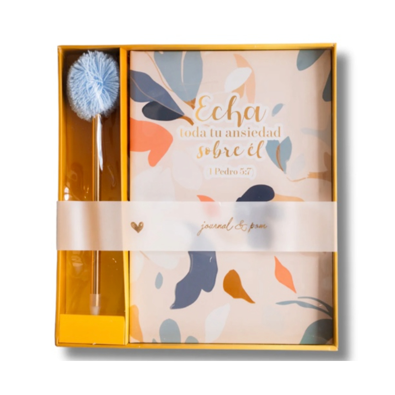 Incluye un journal de tapa dura, con diseño delicado y colorido, acompañado de un bolígrafo diferente, perfecto para hacer de cada palabra escrita un momento especial ✍️🕊️.