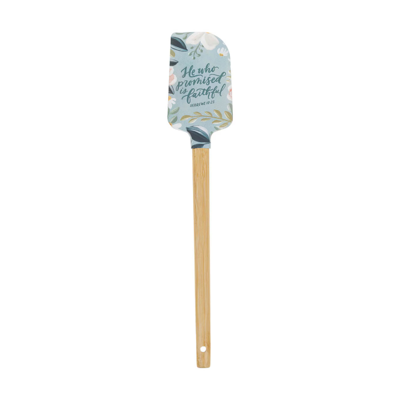 espátula de silicona azul claro con diseño floral «El que prometió es fiel» añade paz y fe a tu rutina culinaria.