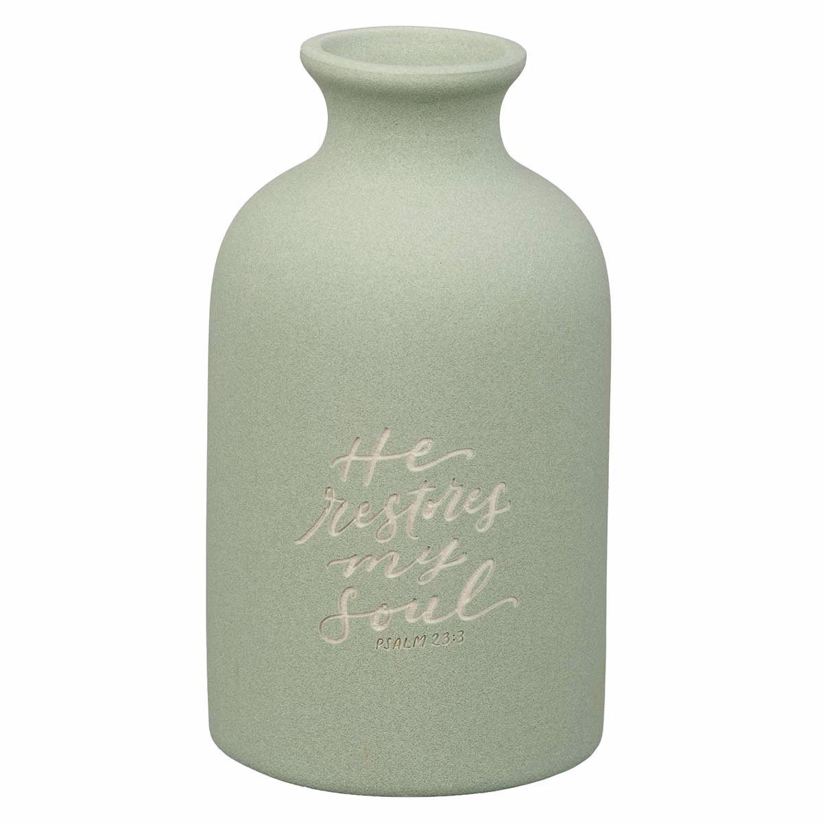 jarrón de mesa de cerámica verde «Él restaura mi alma» . El diseño sencillo y el mensaje inspirador de este delicado jarrón crearán un ambiente de paz y alegría dondequiera que lo coloques.