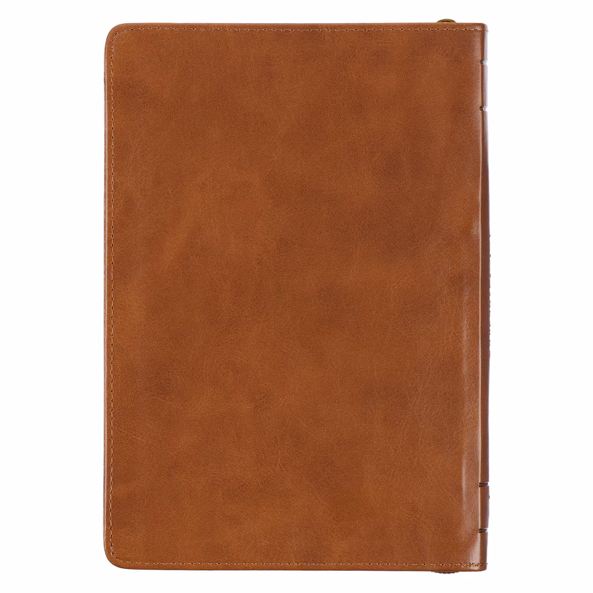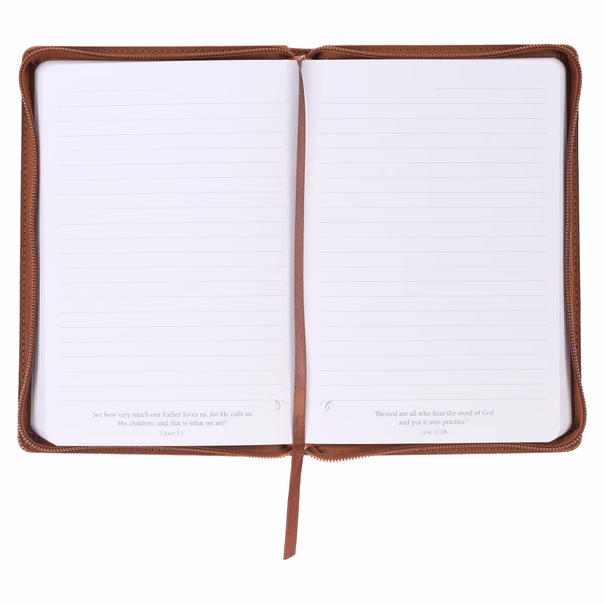 Versículos bíblicos alentadores, escritos en diversas tipografías grabadas en relieve, llenan la portada de esta libreta de imitación de cuero color caramelo. Las letras están grabadas en relieve para crear un rico diseño tono sobre tono marrón.