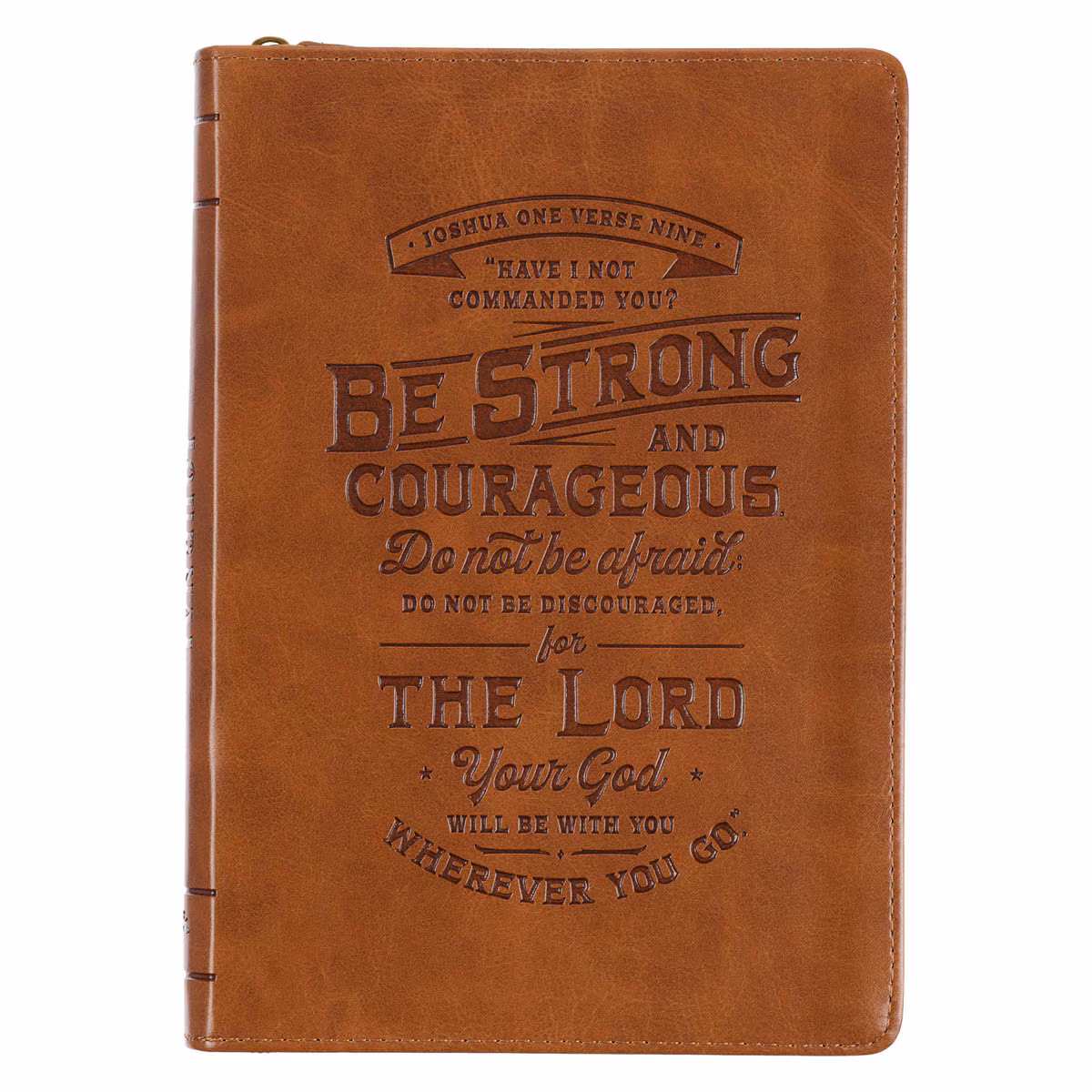 El mensaje de la libreta clásic de piel sintética color marrón caramelo «Sé fuerte» con zíper te animará a planificar con valentía tu día en sus páginas, sabiendo que Dios está a tu lado en cada paso del camino.
