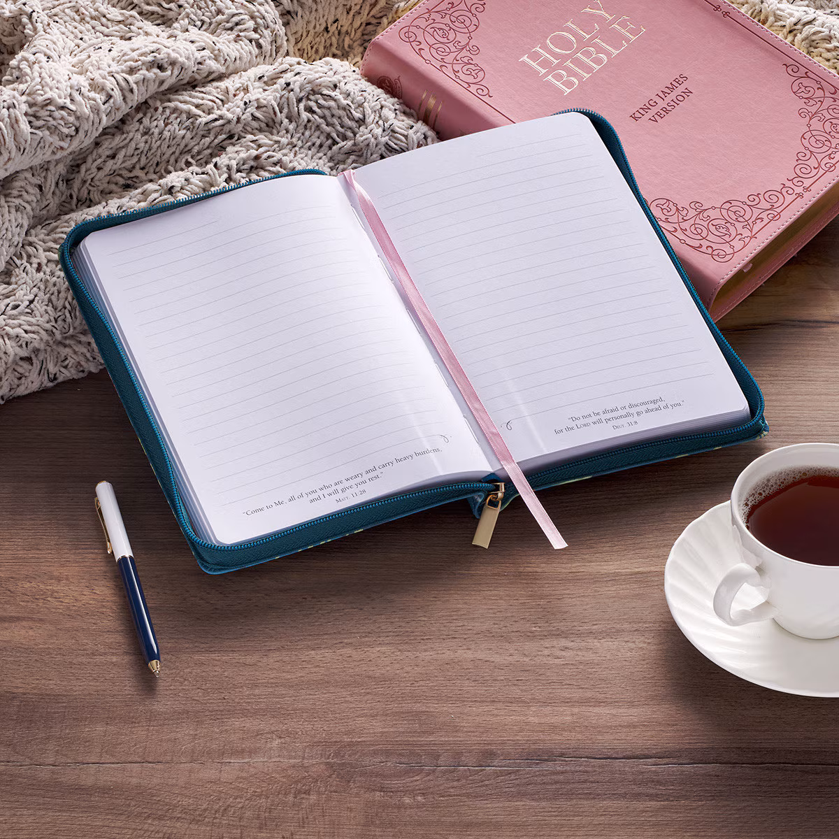 Un marcapáginas de cinta de raso a juego está cosido al lomo del cuaderno y te ayuda a marcar la página. Las costuras reforzadas le dan mayor durabilidad, y el cierre de cremallera garantiza que el contenido y tus notas permanezcan seguros. La cremallera tiene un tirador metálico dorado. Este cuaderno contiene 336 páginas rayadas listas para que escribas tus propias palabras. Cada página incluye un versículo bíblico adicional impreso en la parte inferior. Una página de dedicatoria te permite anotar una ocasión especial.