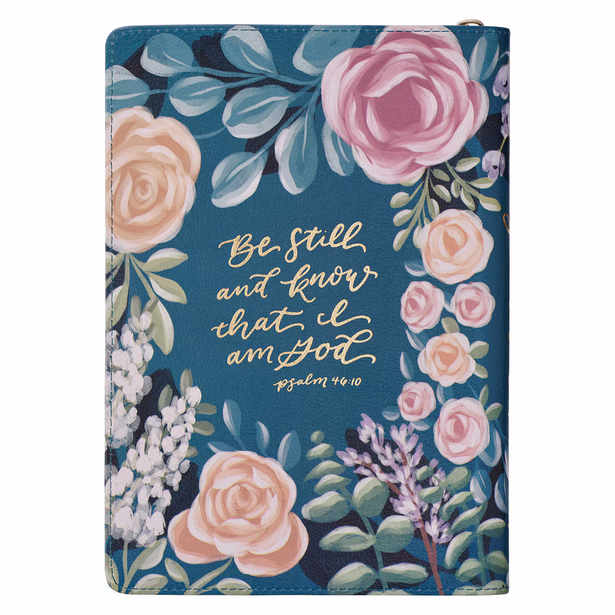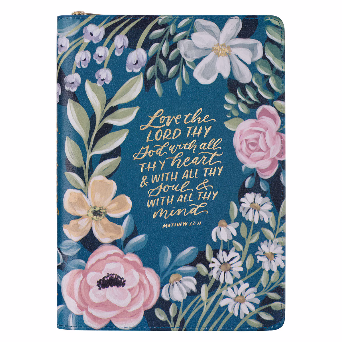 La libreta «Ama al Señor» en piel sintética con estampado floral color verde azulado y zíper combina un hermoso y colorido diseño floral con el recordatorio de amar a Dios con todo lo que tienes y eres.