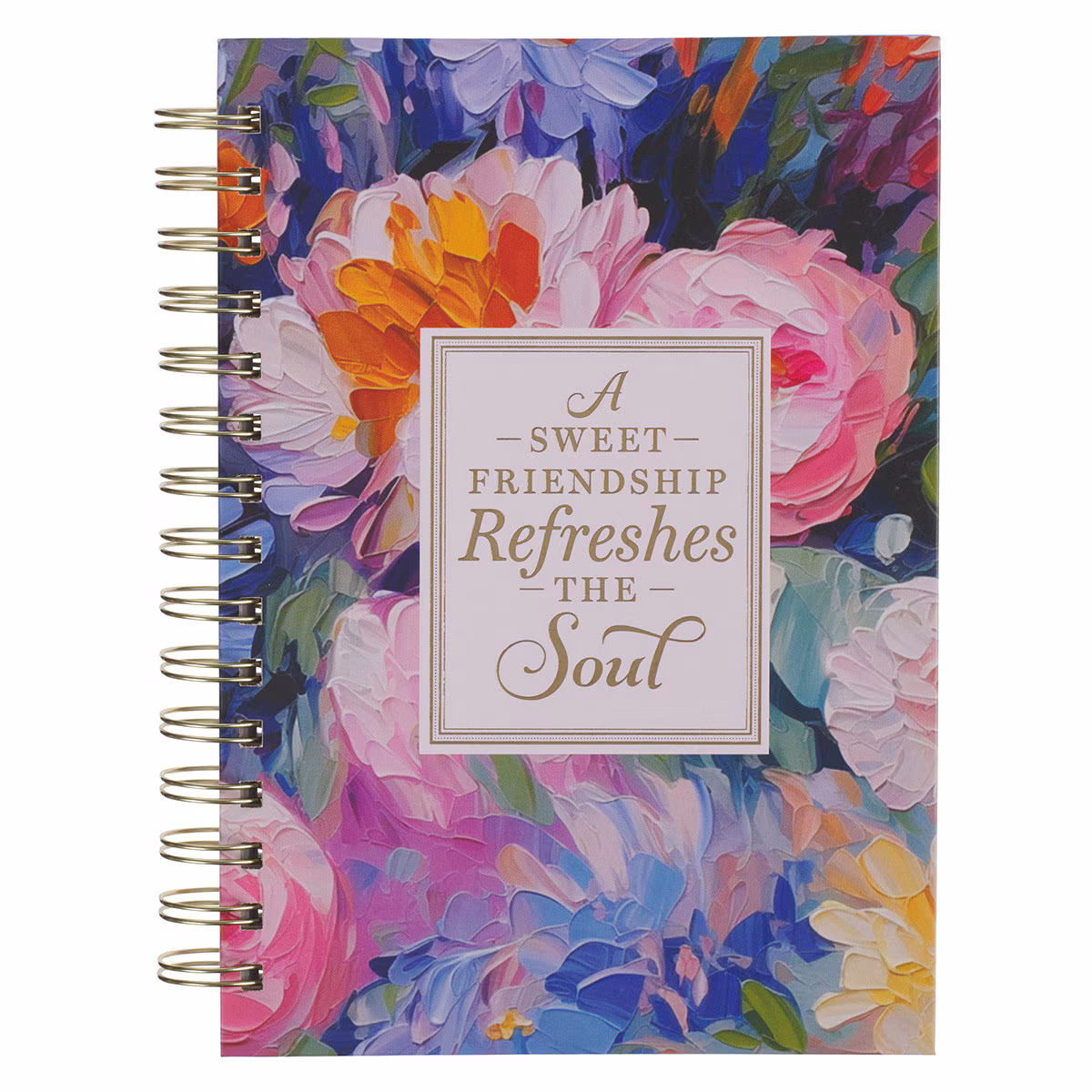 El vibrante cuaderno en espiral «Una dulce amistad refresca el alma» celebra la alegría de la amistad con un impresionante ramo de flores coloridas.