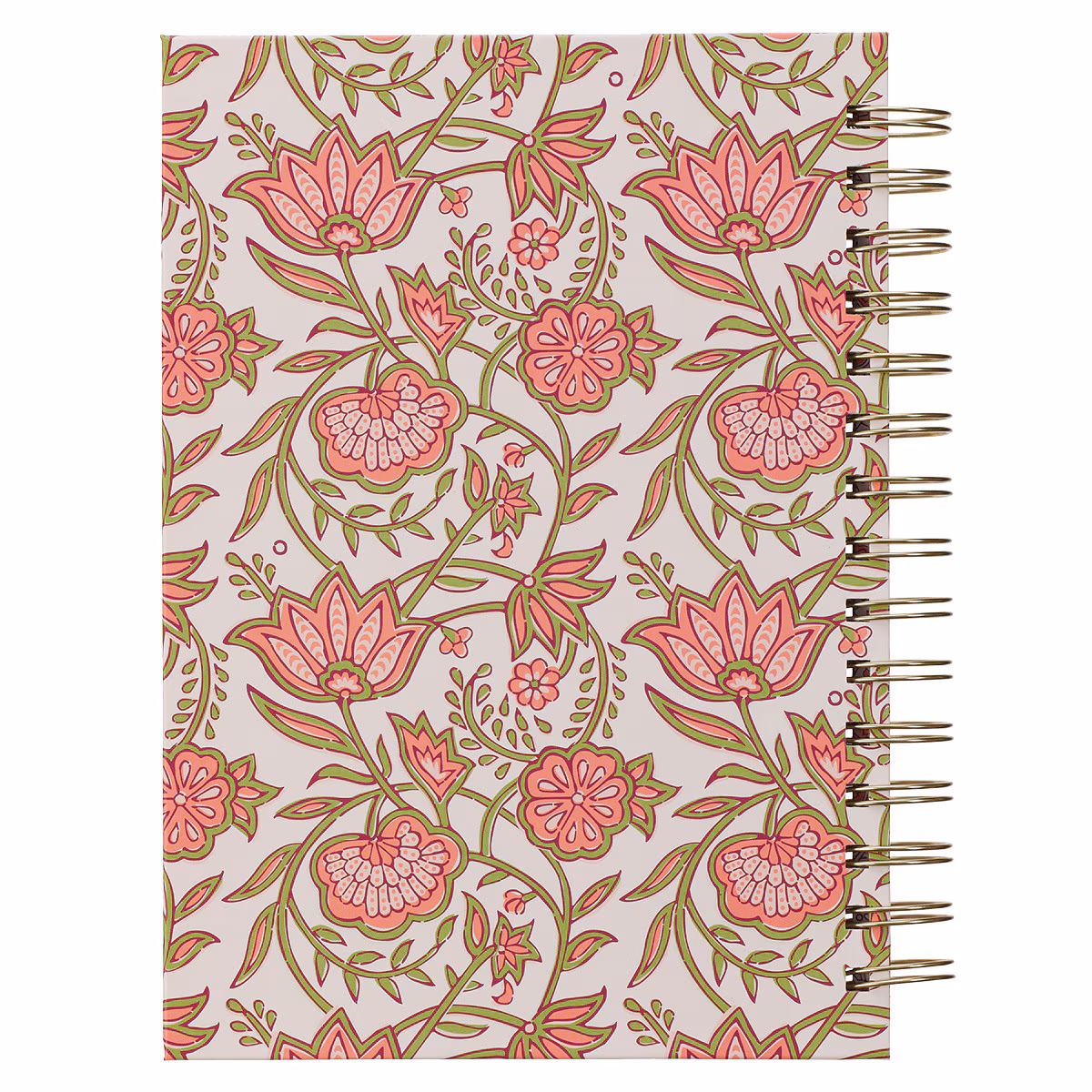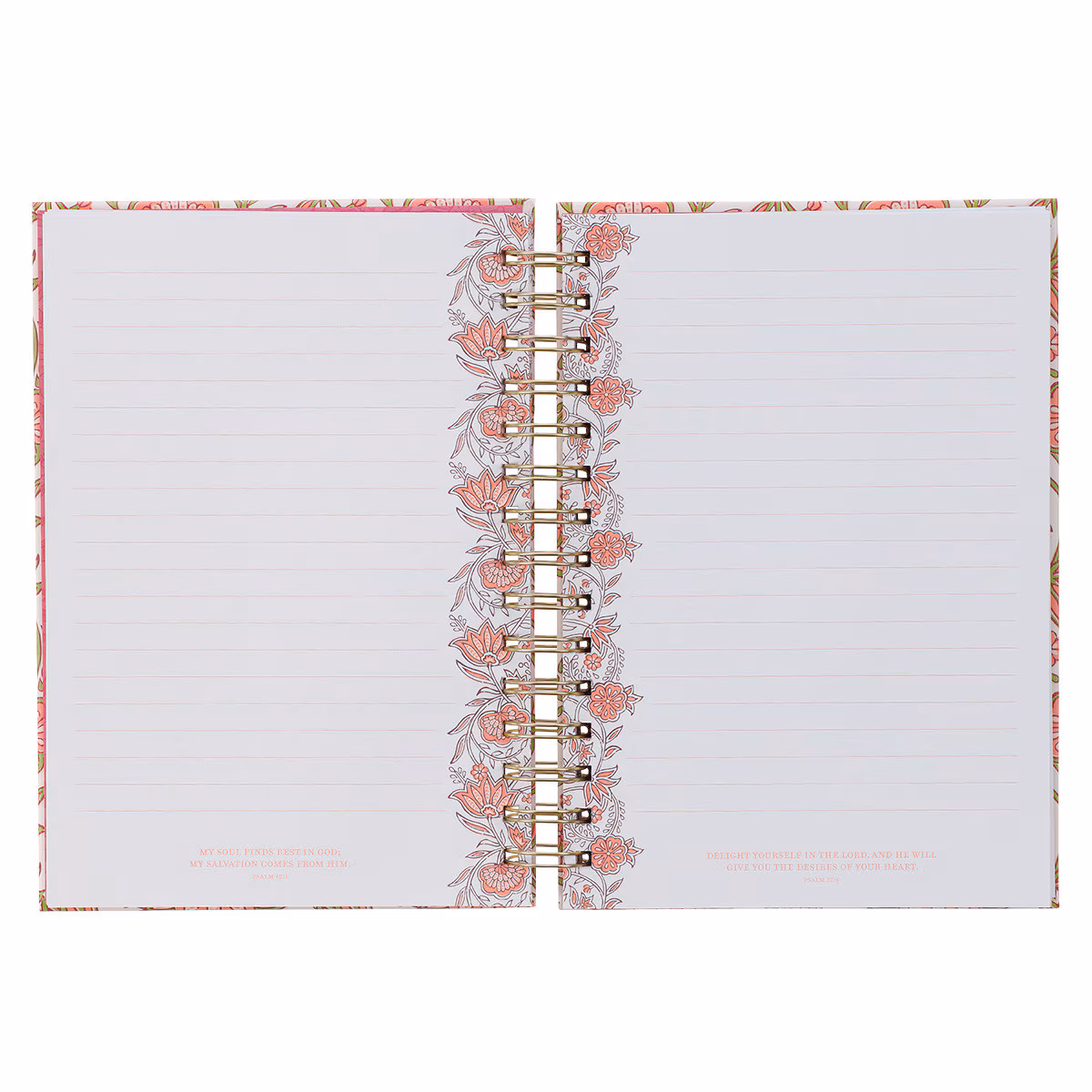 Cada una de las 192 páginas rayadas de este cuaderno, de color blanco crema, presenta un versículo bíblico único al pie, ofreciendo un aliento especial diario de la Palabra de Dios. Además, un hermoso diseño floral rosa adorna el borde interior de cada página.