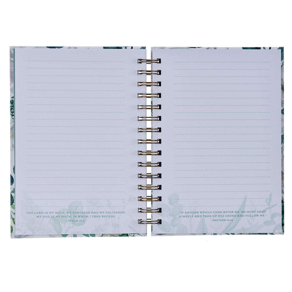 El diseño floral continúa en la contraportada. Este cuaderno está encuadernado con una resistente espiral de bronce antiguo que armoniza con los detalles dorados del diseño. Cada página está rayada e incluye un versículo bíblico impreso al pie para brindar aliento diario de la Palabra de Dios. Encontrarás un alegre diseño floral en la parte inferior de cada página, que añade un toque de vida a las blancas páginas del cuaderno.