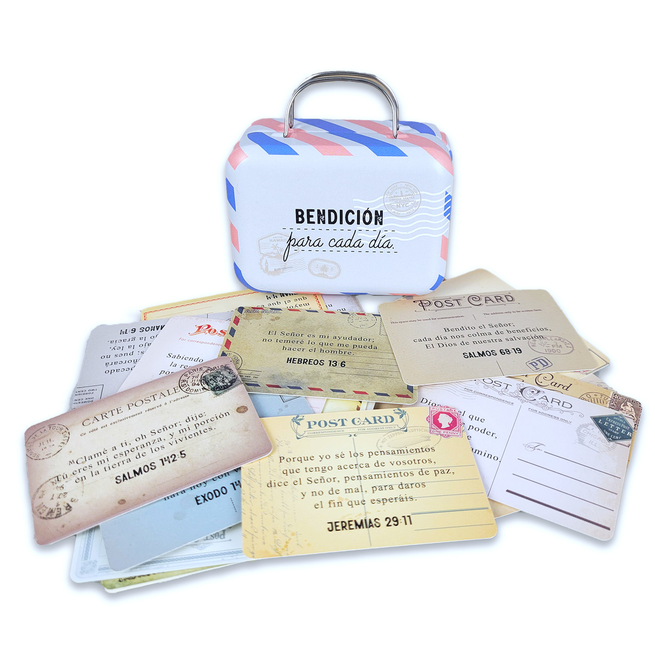 40 tarjetas con promesas bíblicas para leer cada día. Viene en una caja metálica de bello diseño. En el reverso hay espacio para una dedicatoria.