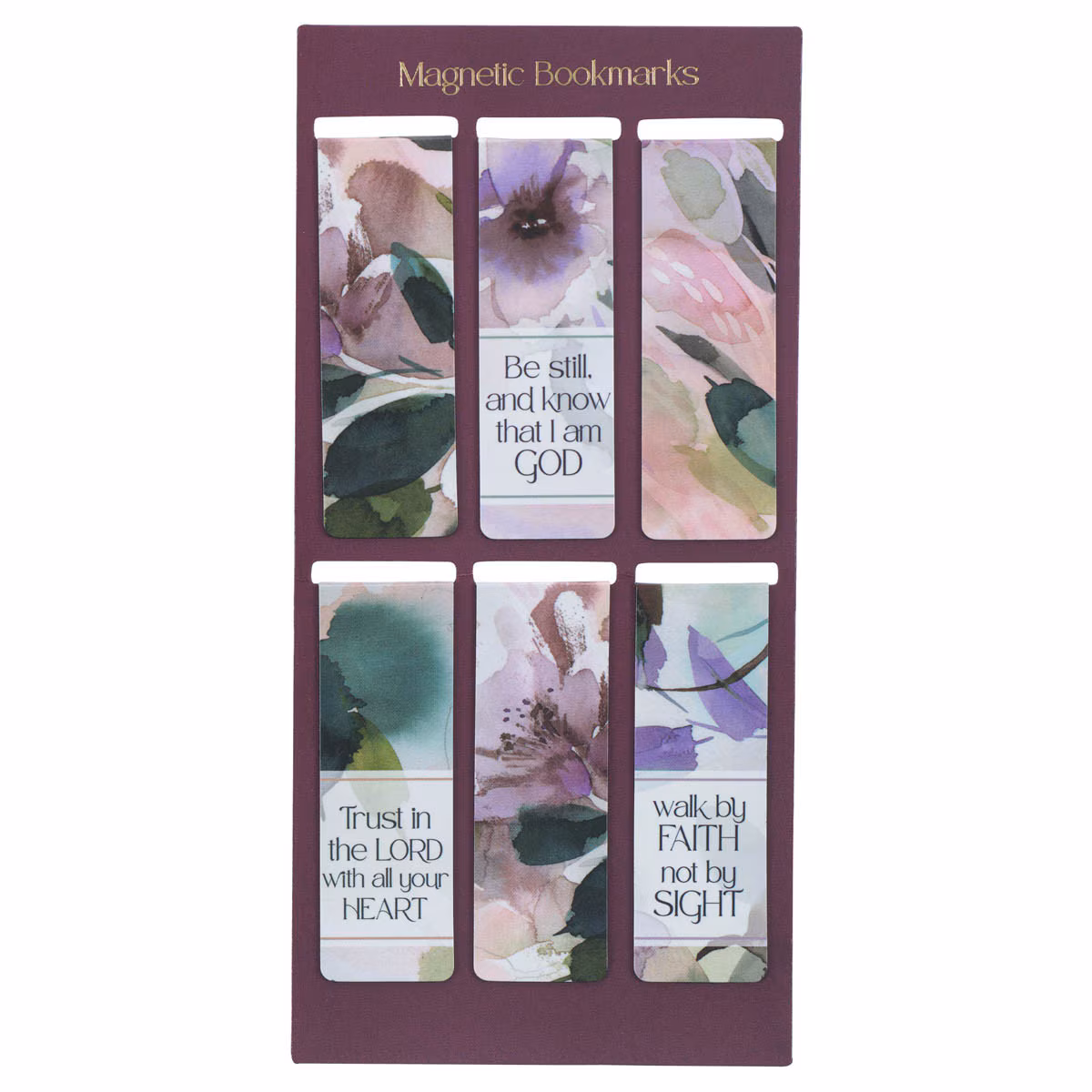 Suaves flores en acuarela con tonos joya realzan los mensajes de fe de los seis marcapáginas del juego. Los siguientes mensajes aparecen en tres de los marcapáginas. Tres marcapáginas solo presentan diseños florales sin texto.