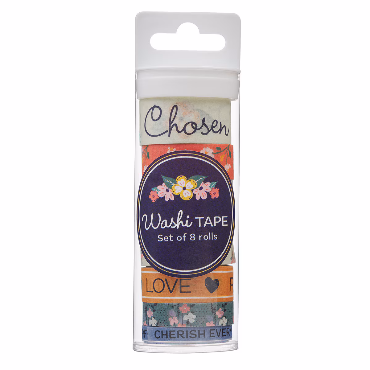 set de cintas washi «Elegidos y Apreciados» presenta una alegre combinación de palabras alentadoras y encantadores diseños florales para dar vida a tus diarios bíblicos, tarjetas y regalos. Con flores de colores vibrantes y mensajes reconfortantes, cada rollo te recuerda el amor de Dios y tu valor en Él.
